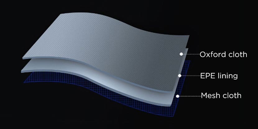 Несмотря на кажущуюся простоту, ткань спинки рюкзака состоит из трёх слоев, расположение которых продуманно для отвода тепла и распределения нагрузки - трёхслойная сетчатая ткань, наполнитель из вспененного полиэтилена и ткань Оксфорд.