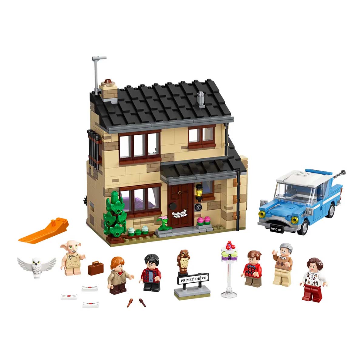 - В набор входят шесть минифигурок: Гарри Поттер, Рон Уизли, Дадли Дурсль, Вернон Дурсль, Петунья Дурсль и Добби, а также фигурка совы Букли, летающий автомобиль с открывающейся крышей, дверьми и багажником и множество других реалистичных аксессуаров из фильма.